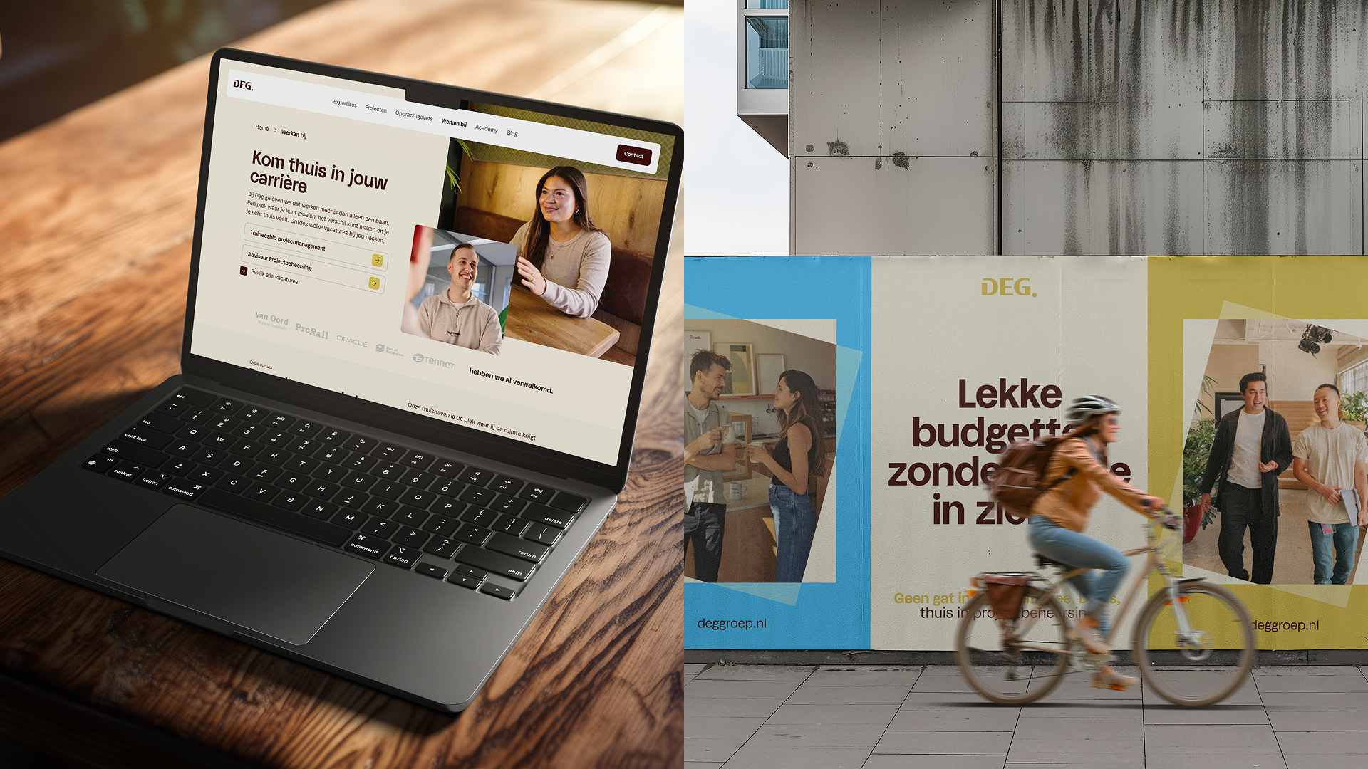Samen met Deg gingen we terug naar de kern: waarom werken mensen hier graag, en waarom kiezen klanten juist voor dit bureau? Het antwoord zat niet in een nieuw woord of een andere kleur, maar in hoe Deg dagelijks werkt. Mensen voelen zich gezien. Adviseurs nemen de tijd om écht te begrijpen wat er speelt in een project. En klanten weten dat ze kunnen vertrouwen op deskundigheid én eerlijkheid. Dat gevoel wilden we vangen. Zo ontstond Deg’s nieuwe verhaal: een bureau dat voelt als thuiskomen. Niet in de zin van ‘gezellig’, maar in de betekenis van herkenbaar, betrouwbaar en menselijk. Een plek waar specialisten hun vak kunnen uitoefenen en tegelijk zichzelf kunnen zijn. En waar opdrachtgevers niet alleen een oplossing krijgen, maar ook een adviseur die naast hen staat en past in manier van werken en karakter. Want juist in projecten die moeizaam lopen, is Deg thuis in projectbeheersing.